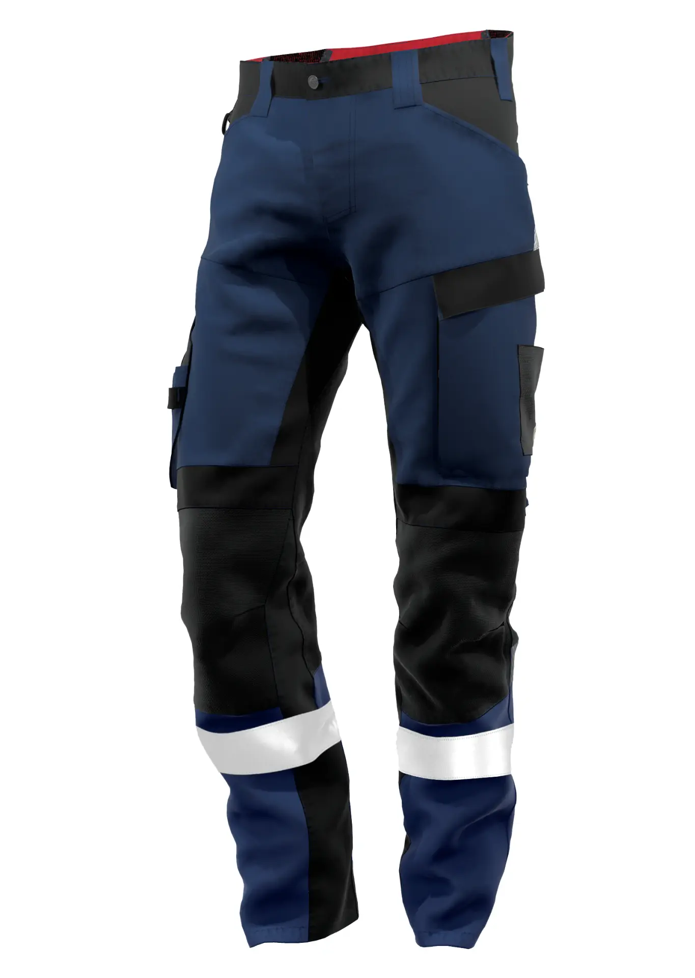 - Bund mit Knopf, erhöhter rückwärtiger Bund mit Strickeinsätzen, Gürtelschlaufen, D-Ring